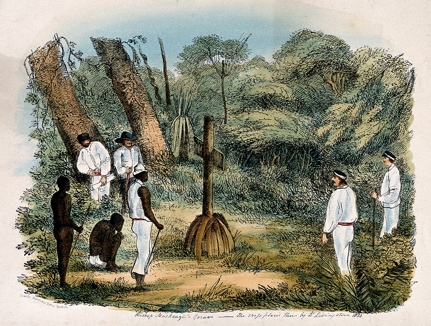 Foto: Tegning af en Anglikansk biskops grav, rejst af David Livingstone, omgivet af både Europæere og Afrikanere