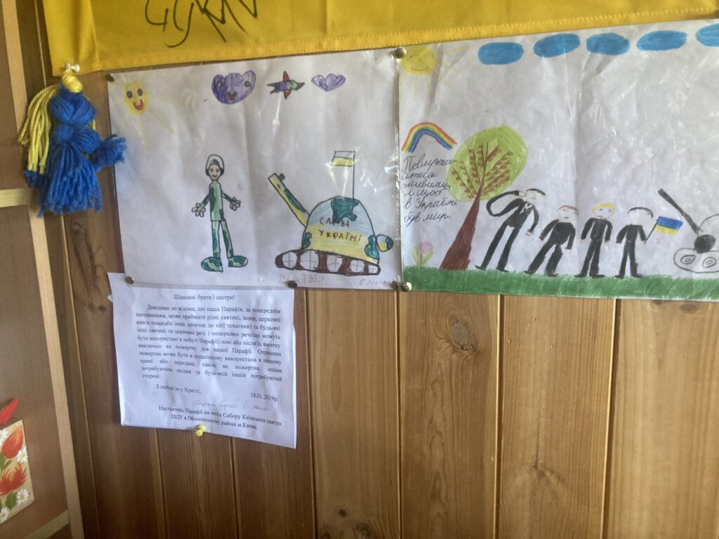 I kirkerummet, som maksimalt kan rumme 30 mennesker, hænger en række ikoner og nogle børnetegninger. Vi spurgte ind til børnetegningerne og fik at vide, at en af dem, som forestillede en ukrainsk soldat foran en kampvogn, er tegnet af en dreng, hvis far er forsvundet ved fronten for 8 måneder siden. Man ser for sig, hvordan denne dreng har tegnet og hængt dette stykke papir op som en bøn om, at hans far ikke er dræbt eller russisk krigsfange med alt, hvad det indebærer. »Kom hjem i live«, står der med børnehåndskrift.